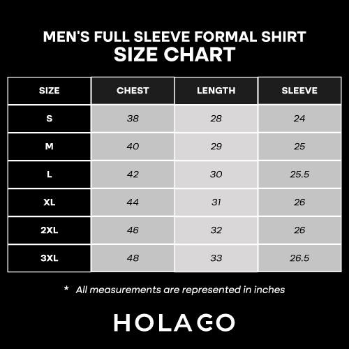 Experience the perfect blend of tradition and modernity with Holago’s full sleeve formal shirts. Ideal for the discerning gentleman who values style and substance, our shirts not only enhance your appearance but also make a statement about your attention to detail and taste. Choose Holago and step into any formal occasion with unparalleled confidence and poise.